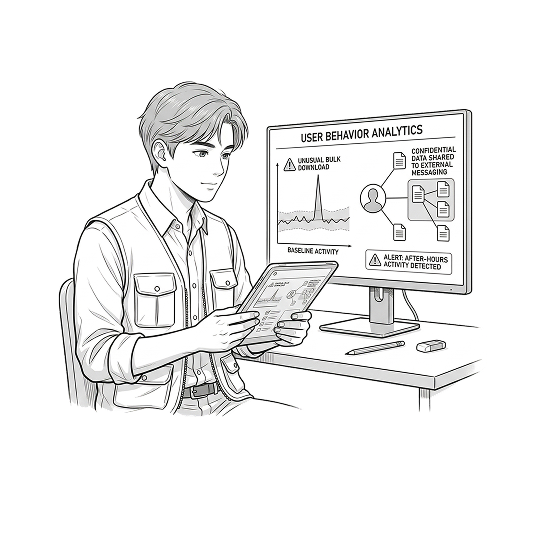 Not every data leak is accidental. User behaviour analytics builds a baseline of normal activity per person and team – flagging unusual patterns like bulk file downloads, messages to external parties, or data sharing outside business hours before they escalate into an incident.